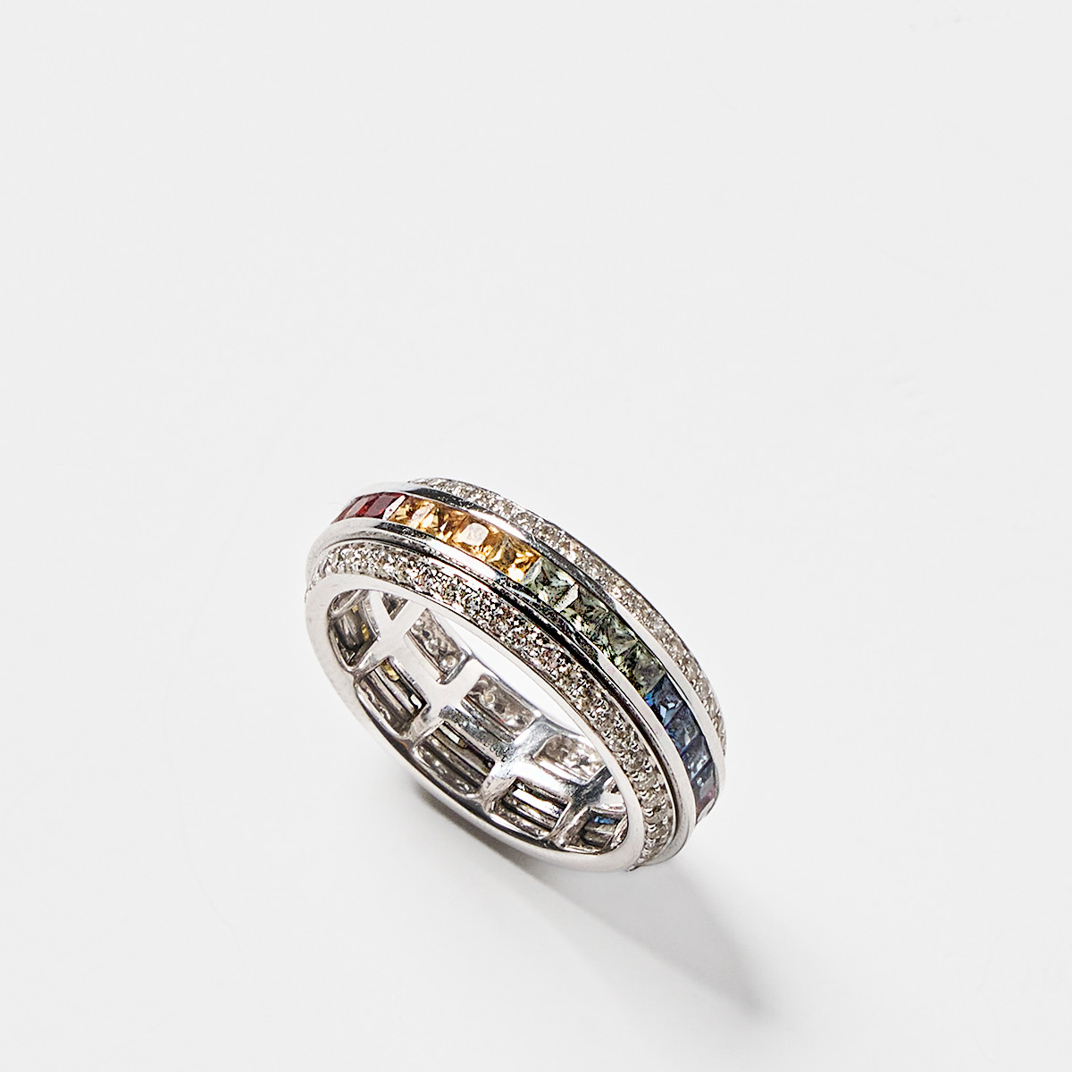 다양한 컬러의 멀티 사파이어로 세팅된 스피닝 링입니다.
