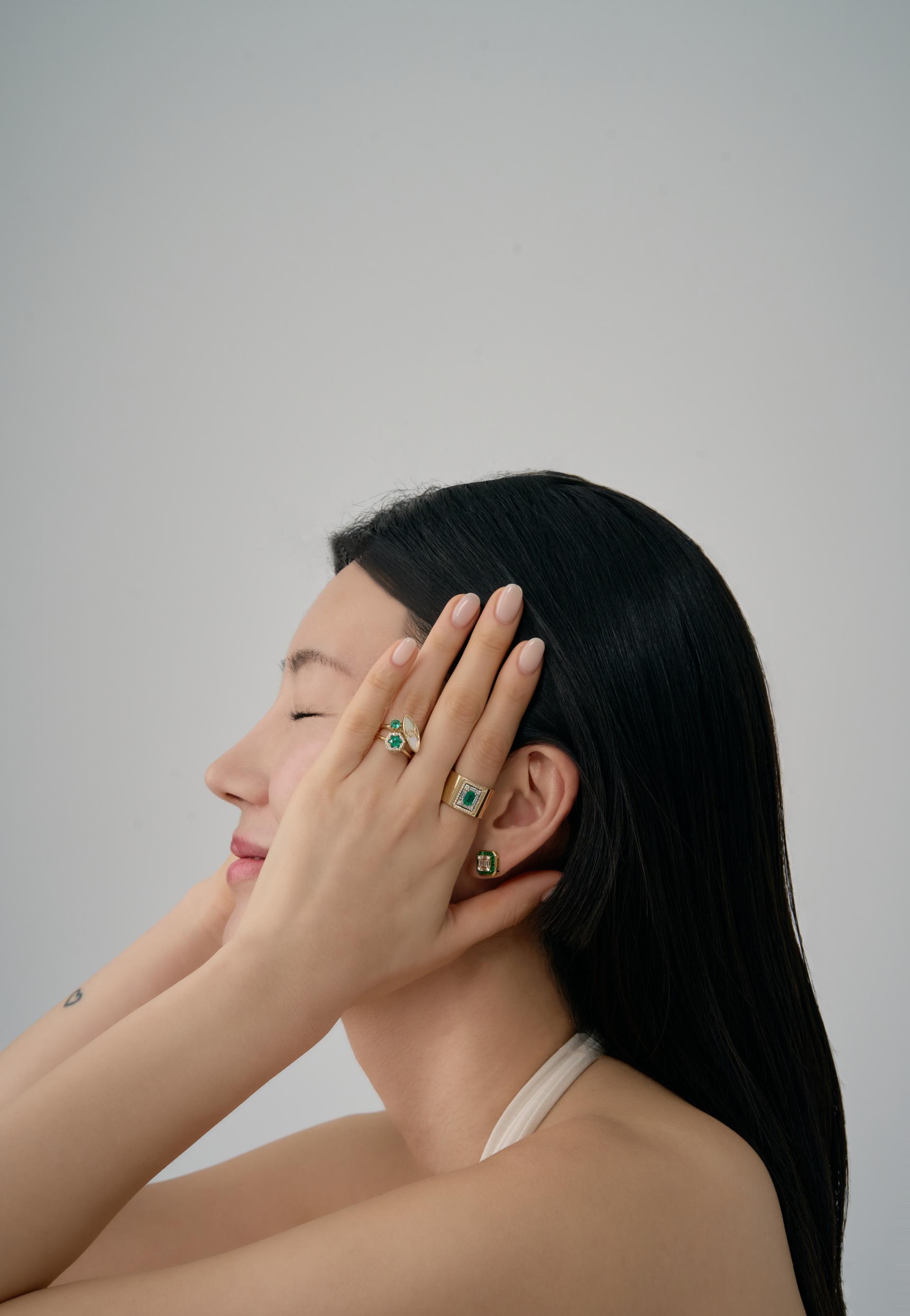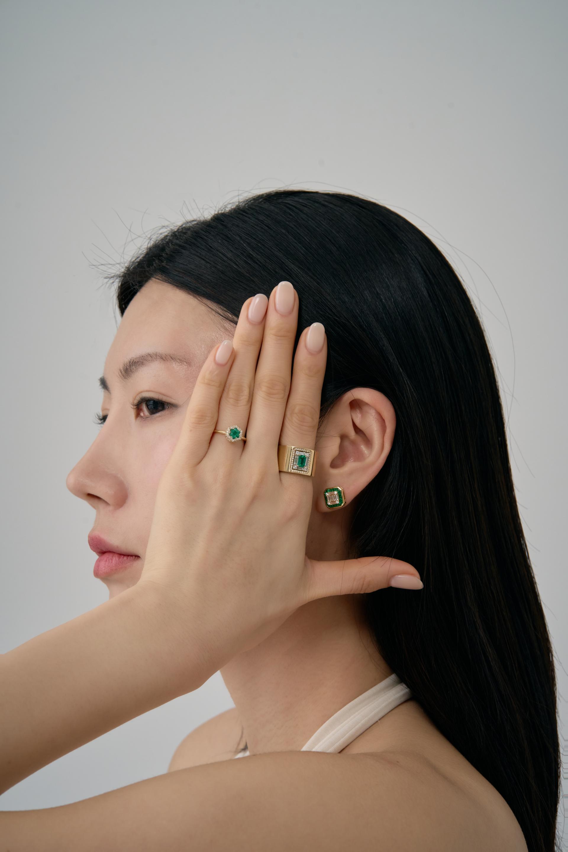 골드와 에메랄드 그리고 다이아몬드는 가장 아름다운 주얼리 컬러조합중 하나임에 분명합니다. 묵직한 중량감과 볼드한 디자인이 당신에게 시선을 집중시킬것입니다. 테파드 컷 다이아몬드들은 인비져블 세팅으로 더욱 빛나며, 주변에 둘러진 에머럴드는 완벽한 컷팅으로 폴리싱되어 제자리에서 그 독특한 초록의 빛깔을 뿜어내고 있습니다. 이 완벽한 이어링은 당신의 품격을 더욱 높여줄 것입니다.
