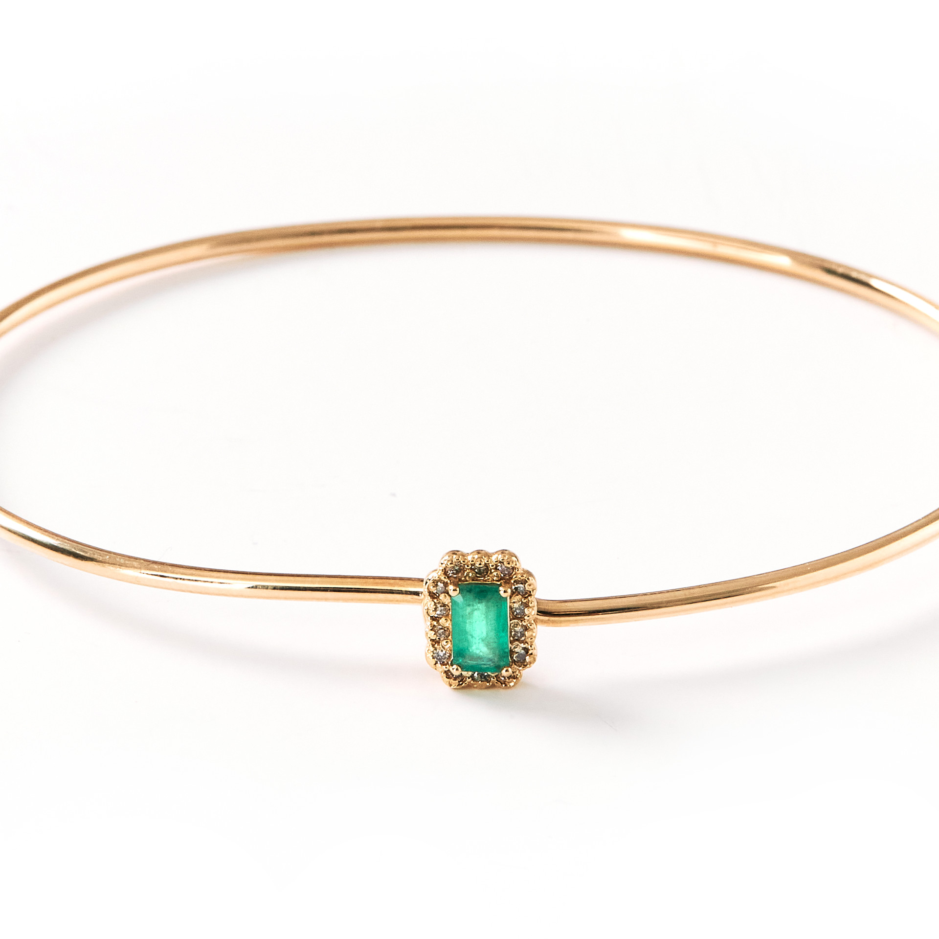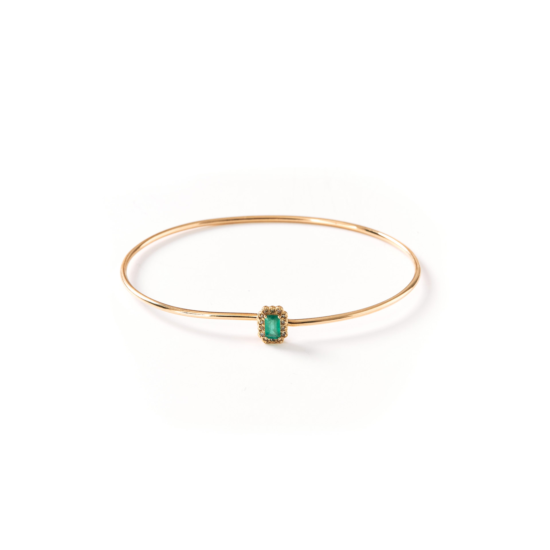 얇은 와이어 뱅글위에 작은 에메랄드 모티브가 사랑스러운 팔찌입니다. 가볍게 하나만 착용하거나 다른 주얼리와 레이어드 해서 개성있게 연출해보세요.