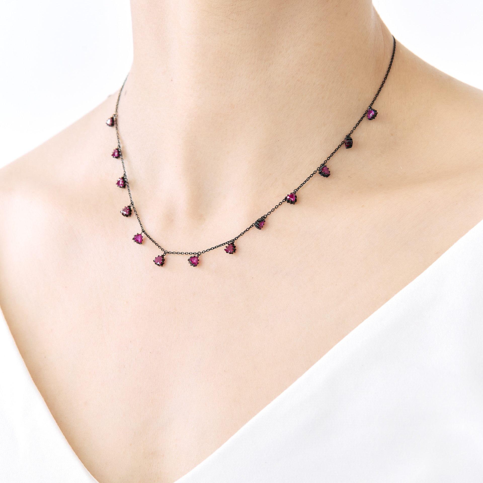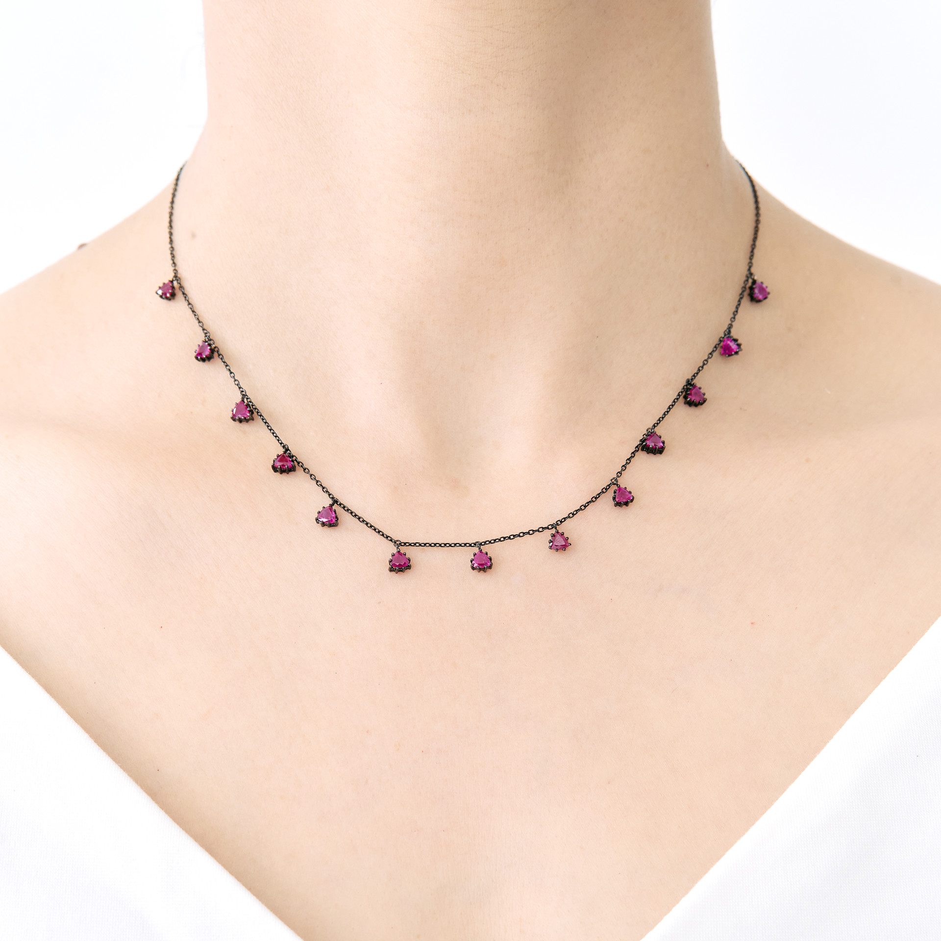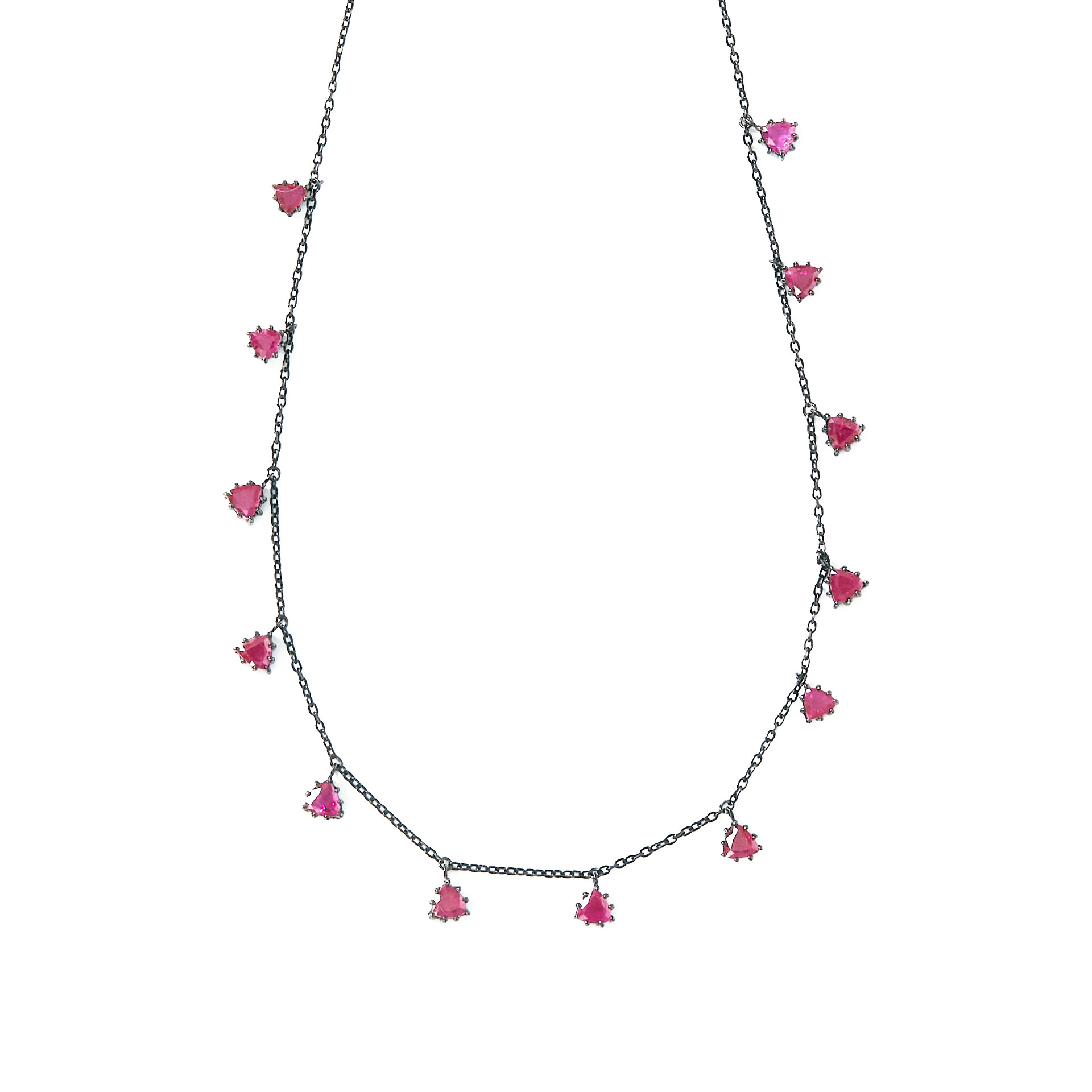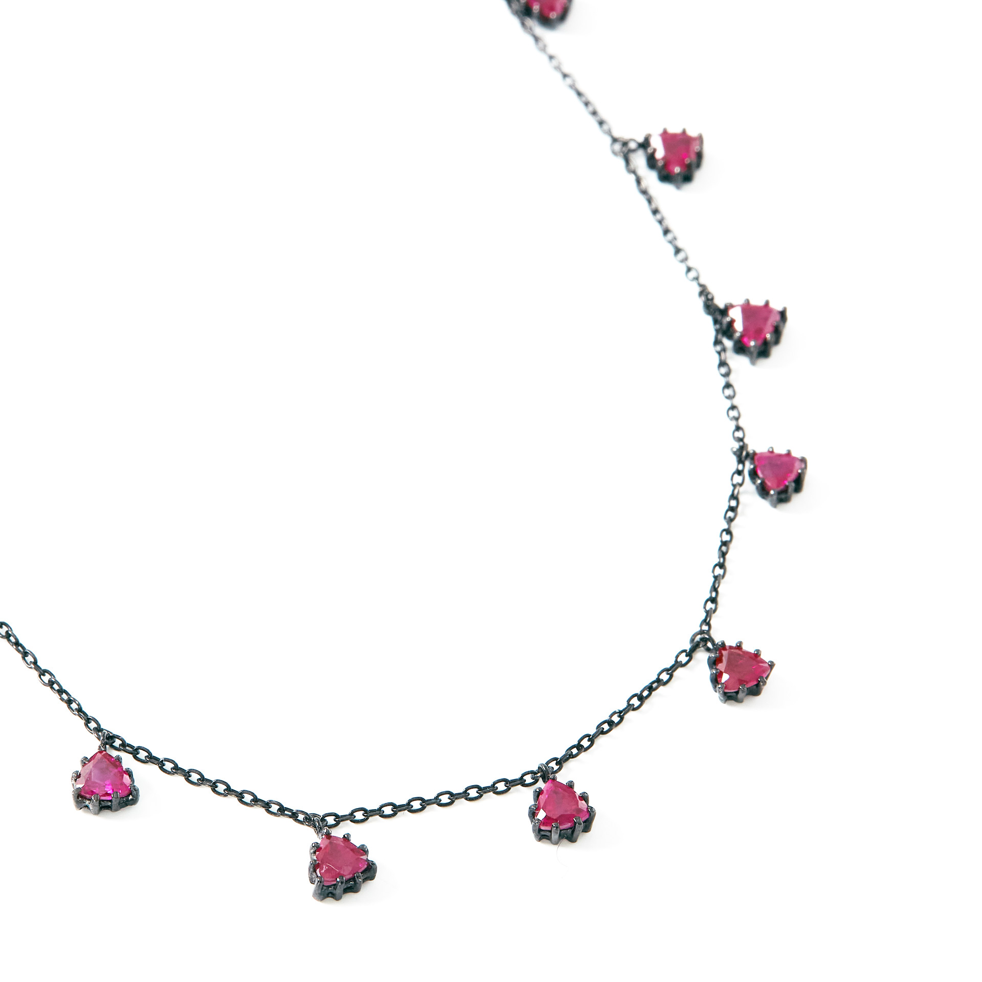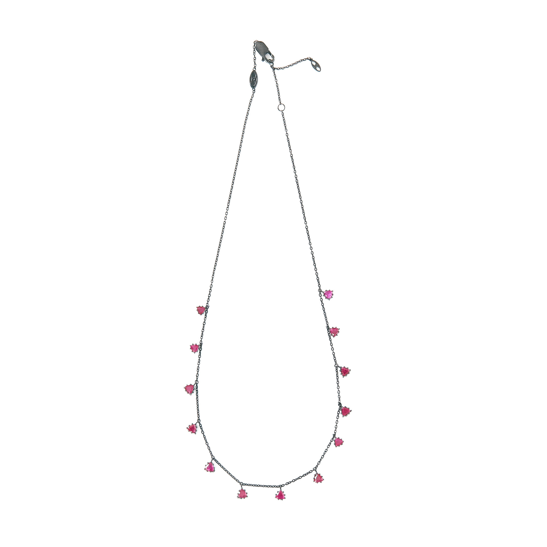 삼각형으로 패싯된 독특한 루비가 특징적인 네크리스입니다. 13개의 Crimson 컬러 루비가 일정한 간격으로 매달려 고혹적인 분위기를 연출합니다. 앤틱하면서도 Mystical한 느낌을 주는 매우 유니크한 네크리스입니다. 이브닝 드레스에 특히 잘 어울리겠지만, 또한 평범한 티셔츠와 매치하여 아방가르드 룩을 완성해보세요.